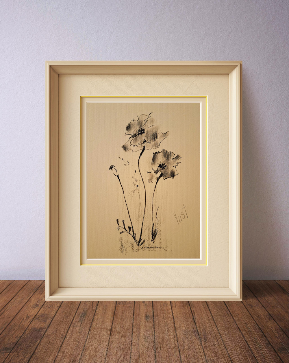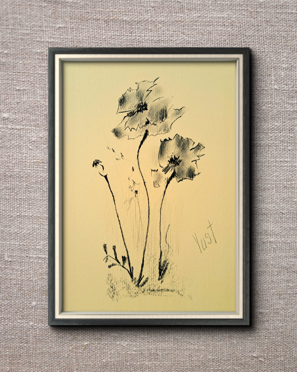 „Blumenfragmente“ ist eine Kohlezeichnung, die florale Motive auf das Wesentliche reduziert. Die monochrome Farbgebung und die klare Linienführung fügen sich nahtlos in minimalistische Wohnkonzepte ein – als ruhiger Blickfang, der Raum atmen lässt.