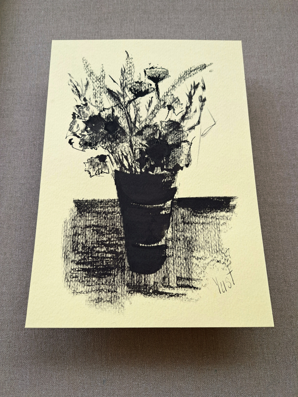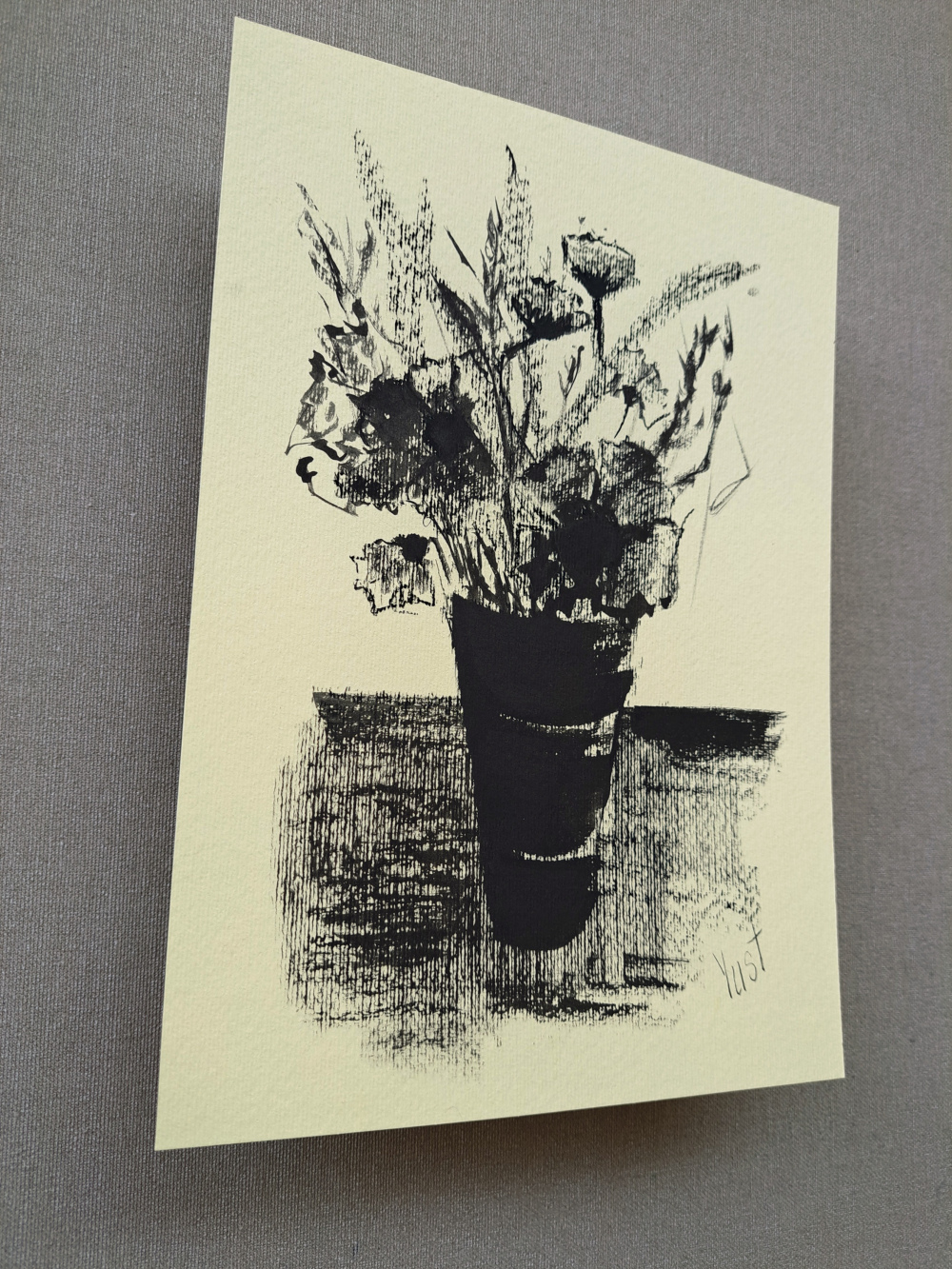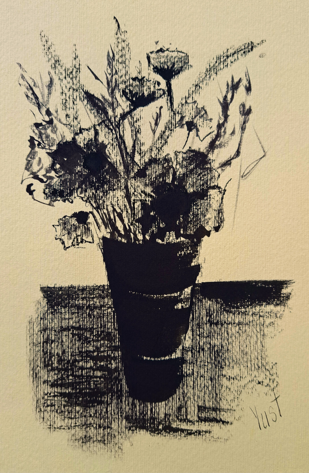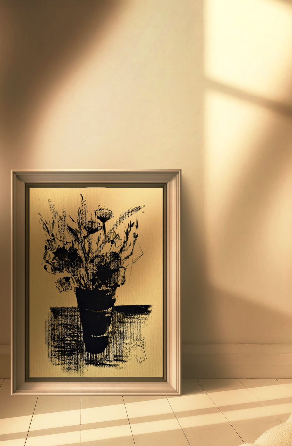 Manche Gedanken lassen sich nicht sprechen – nur zeichnen. „Gedanken in Tinte“ ist eine handgemalte Komposition aus Linien, Schatten und Stille. Die Pflanze im gestreiften Gefäß scheint zu lauschen, als würde sie ein inneres Gespräch führen. Der strukturierte Hintergrund verleiht Tiefe, die Tinte erzählt von Ruhe und Reflexion.